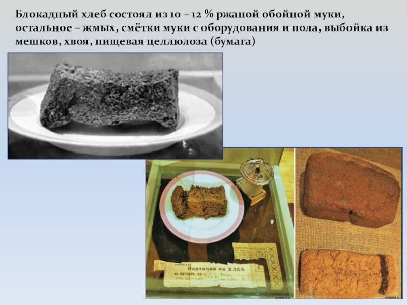 Слайд 9Блокадный хлеб состоял из 10 – 12 % ржаной обойной муки,