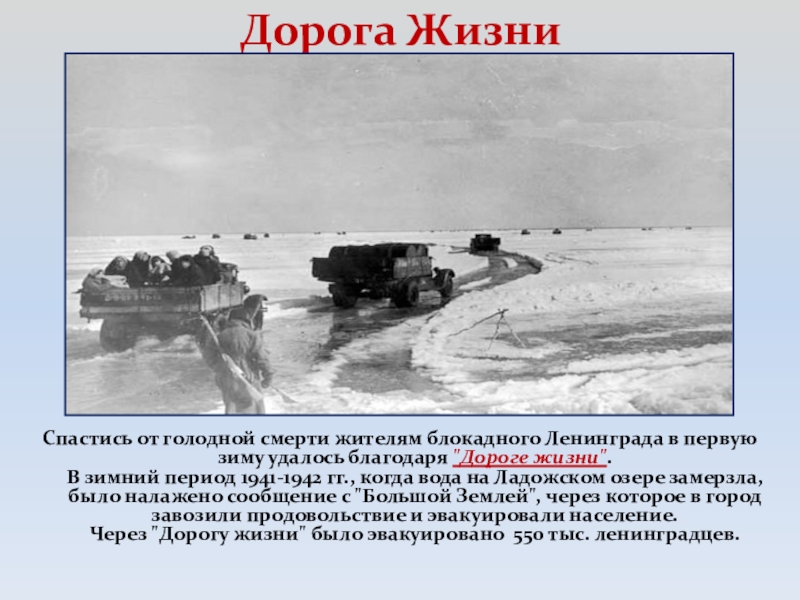 Через "Дорогу жизни" было эвакуировано 550 тыс. ленинградцев.