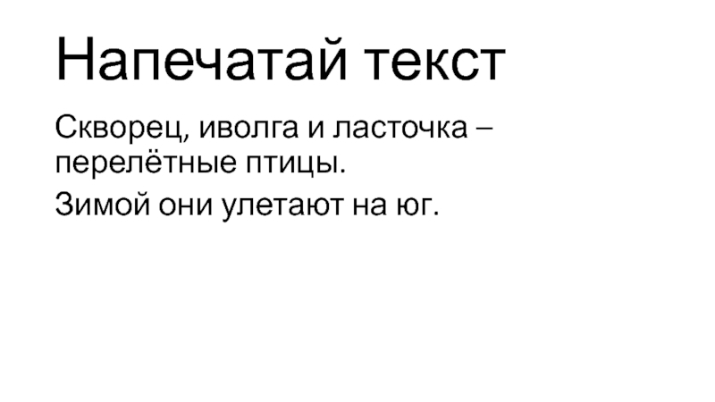 Напечатай текстСкворец, иволга и ласточка – перелётные птицы. Зимой они улетают на юг.