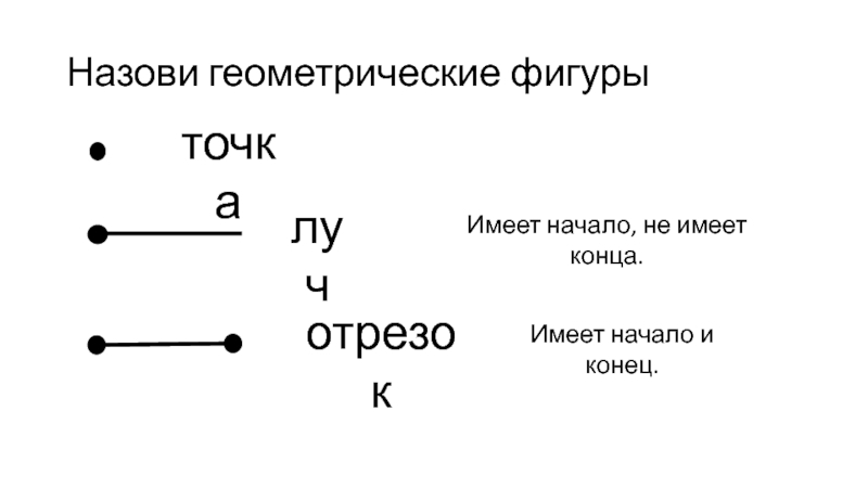 Назови геометрические фигурыточкалучотрезокИмеет начало, не имеет конца.Имеет начало и конец.