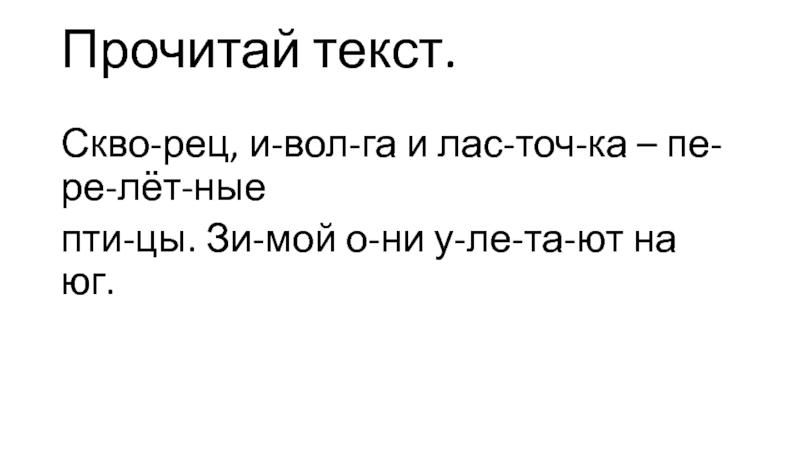 Прочитай текст. Скво-рец, и-вол-га и лас-точ-ка – пе-ре-лёт-ныепти-цы. Зи-мой о-ни у-ле-та-ют на юг.