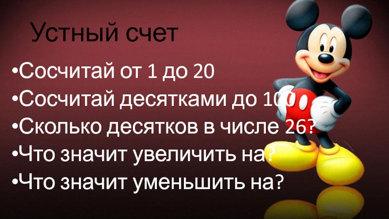 Устный счетСосчитай от 1 до 20Сосчитай десятками до 100Сколько десятков в числе 26?Что значит увеличить на?Что значит