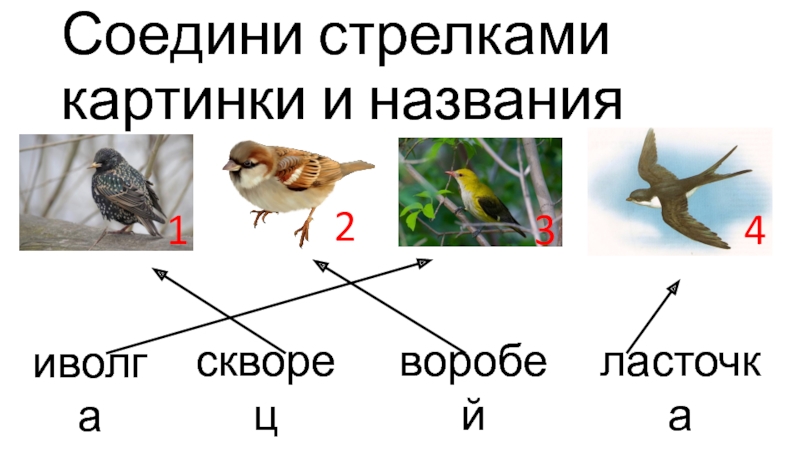 Соедини стрелками картинки и названияиволгаскворецворобейласточка1234