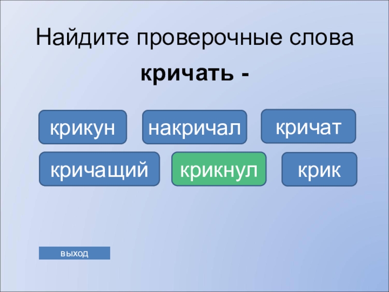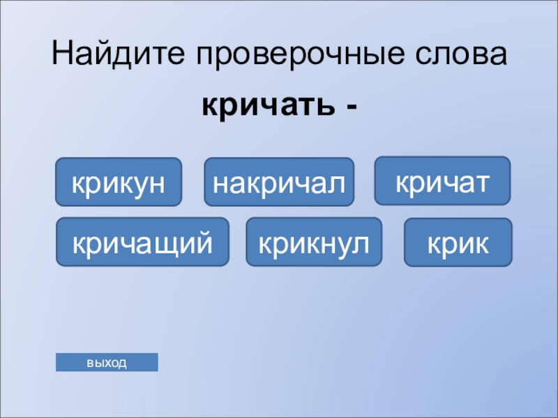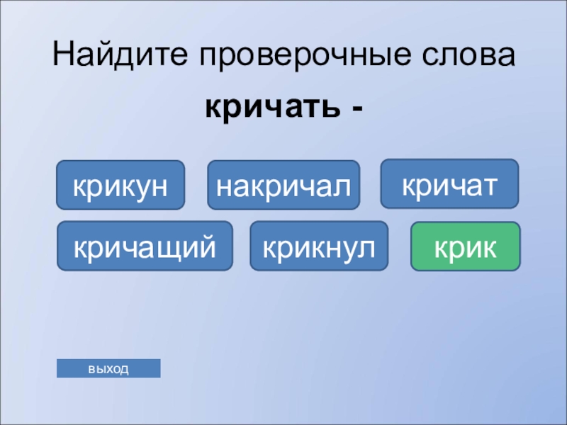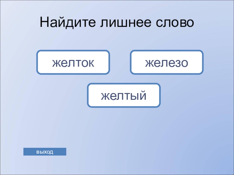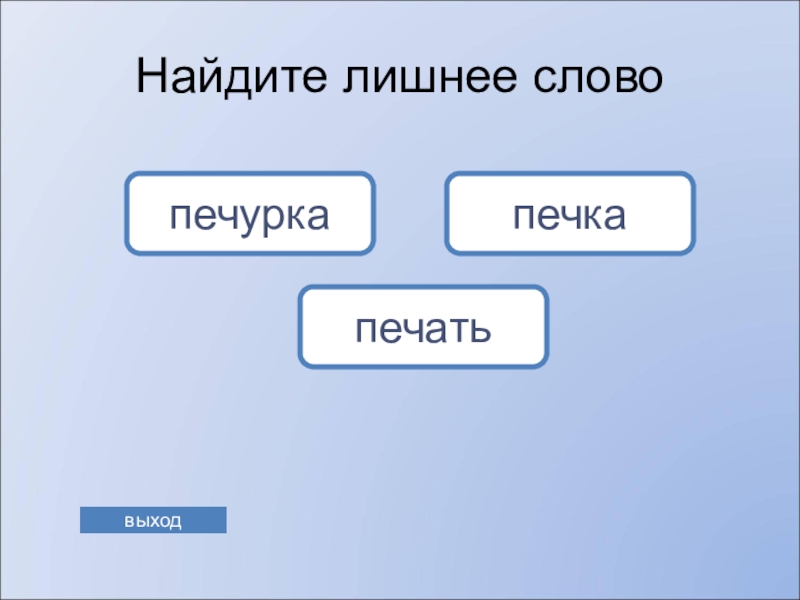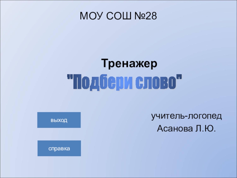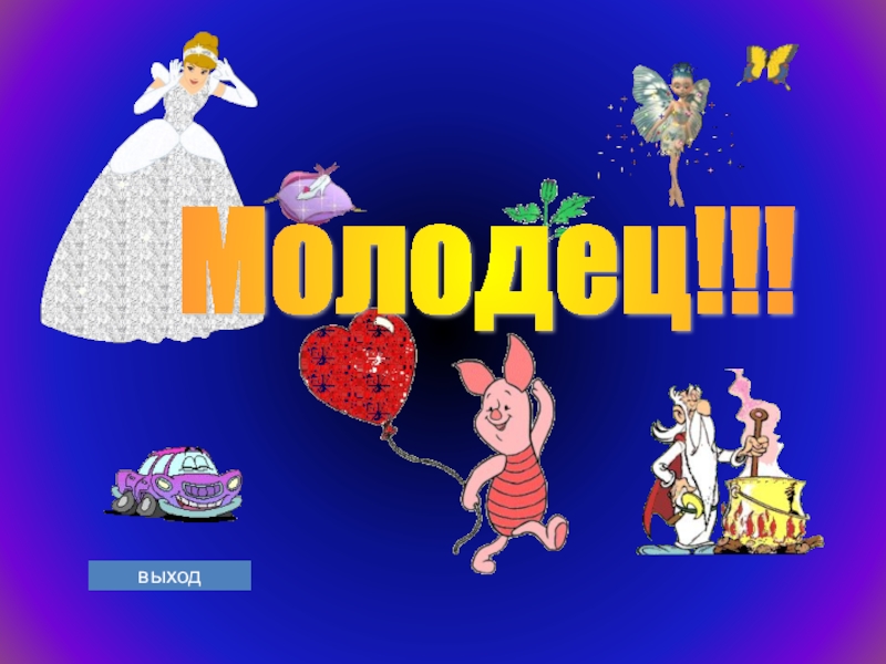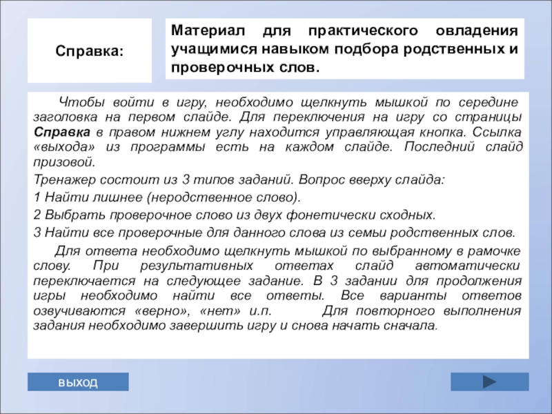 заголовка на первом слайде. Для переключения на игру со страницы Справка в правом нижнем углу находится управляющая кнопка. Ссылка «выхода» из программы есть на каждом слайде. Последний слайд призовой.