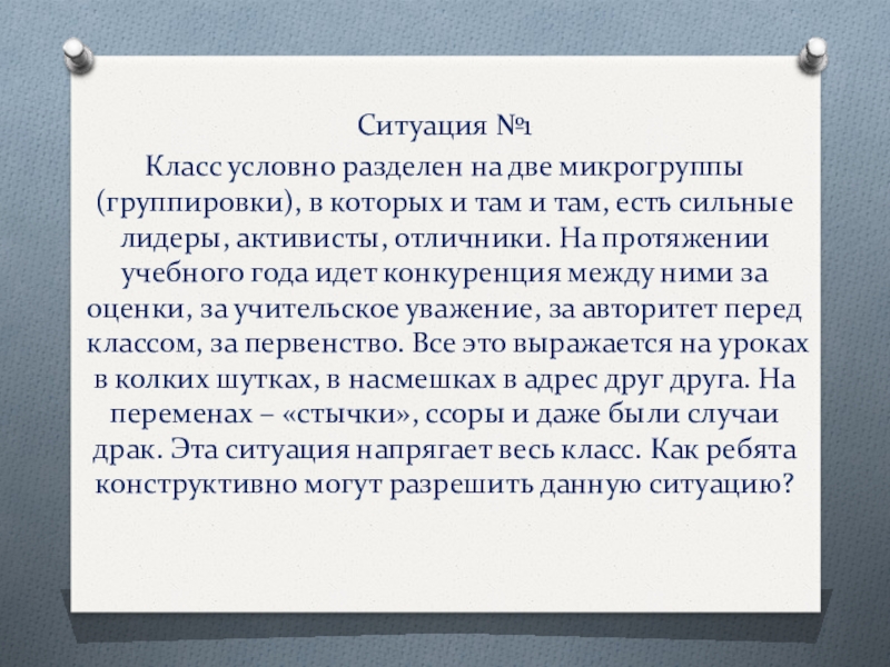 там и там, есть сильные лидеры, активисты, отличники. На протяжении учебного года идет конкуренция между ними за оценки, за учительское уважение, за авторитет перед классом, за первенство. Все это выражается на уроках в колких шутках, в насмешках в адрес друг друга. На переменах – «стычки», ссоры и даже были случаи драк. Эта ситуация напрягает весь класс. Как ребята конструктивно могут разрешить данную ситуацию?