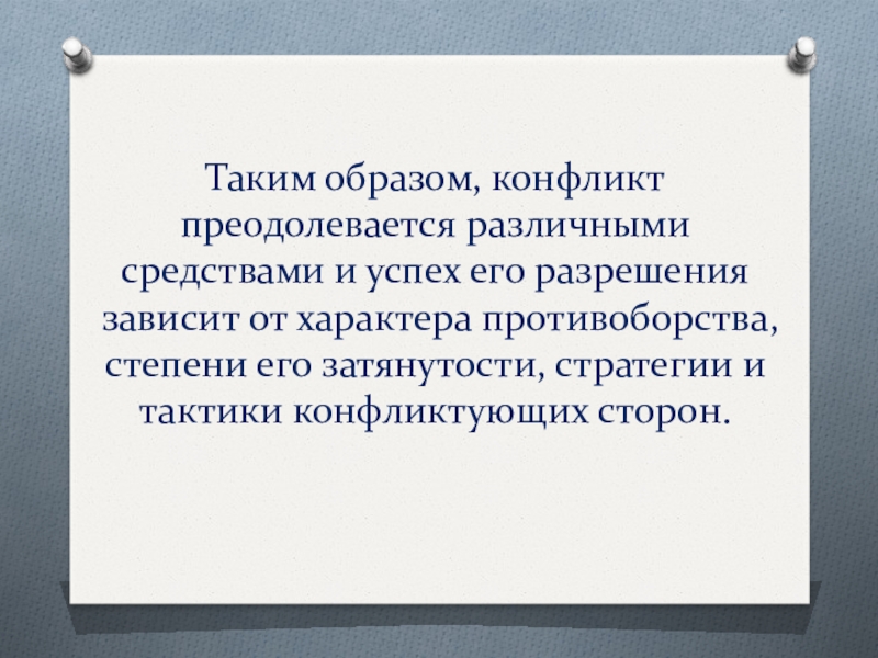 Таким образом, конфликт преодолевается различными средствами и успех его разрешения зависит