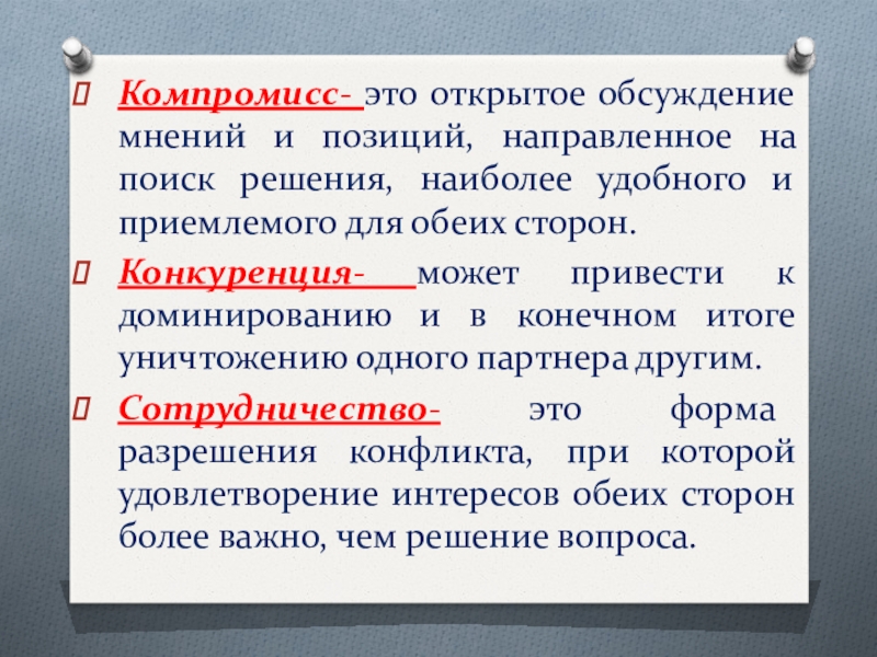 Слайд 10Компромисс- это открытое обсуждение мнений и позиций, направленное на поиск решения,