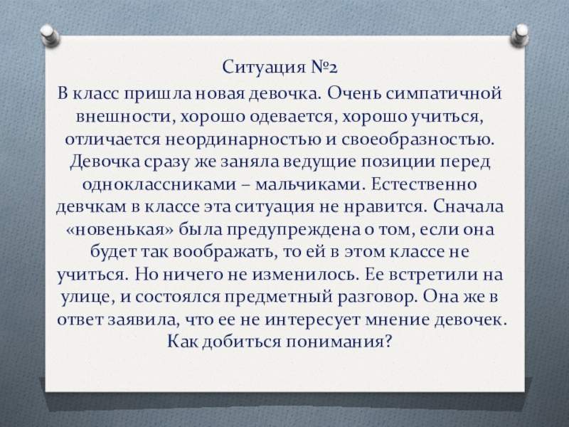 хорошо учиться, отличается неординарностью и своеобразностью. Девочка сразу же заняла ведущие позиции перед одноклассниками – мальчиками. Естественно девчкам в классе эта ситуация не нравится. Сначала «новенькая» была предупреждена о том, если она будет так воображать, то ей в этом классе не учиться. Но ничего не изменилось. Ее встретили на улице, и состоялся предметный разговор. Она же в ответ заявила, что ее не интересует мнение девочек. Как добиться понимания?