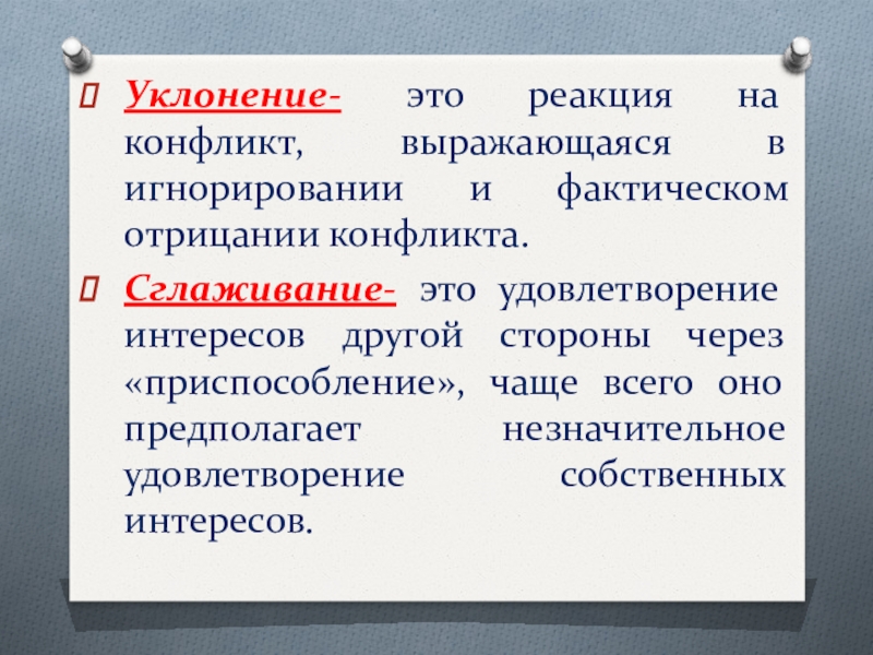 Слайд 9Уклонение- это реакция на конфликт, выражающаяся в игнорировании и фактическом отрицании
