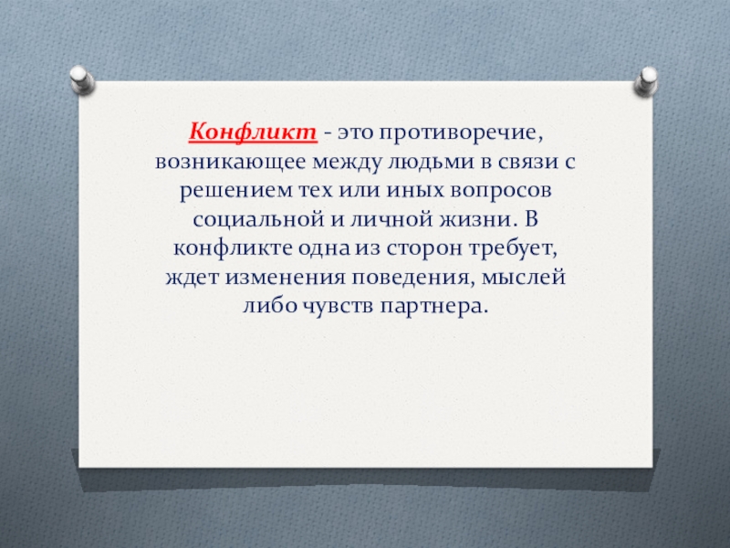 тех или иных вопросов социальной и личной жизни. В конфликте одна из сторон требует, ждет изменения поведения, мыслей либо чувств партнера.
