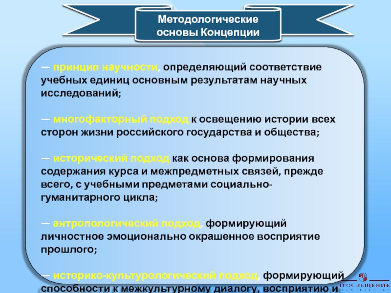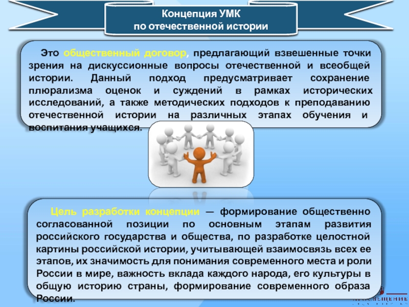 Цель разработки концепции — формирование общественно согласованной позиции по основным этапам развития российского государства и общества, по разработке целостной картины российской истории, учитывающей взаимосвязь всех ее этапов, их значимость для понимания современного места и роли России в мире, важность вклада каждого народа, его культуры в общую историю страны, формирование современного образа России.