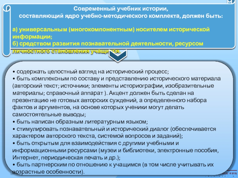 • быть комплексным по составу и представлению исторического материала (авторский текст; источники; элементы историографии, изобразительные материалы; справочный аппарат ). Акцент должен быть сделан на презентацию не готовых авторских суждений, а определенного набора фактов и аргументов, на основе которых ученики могут делать самостоятельные выводы;
