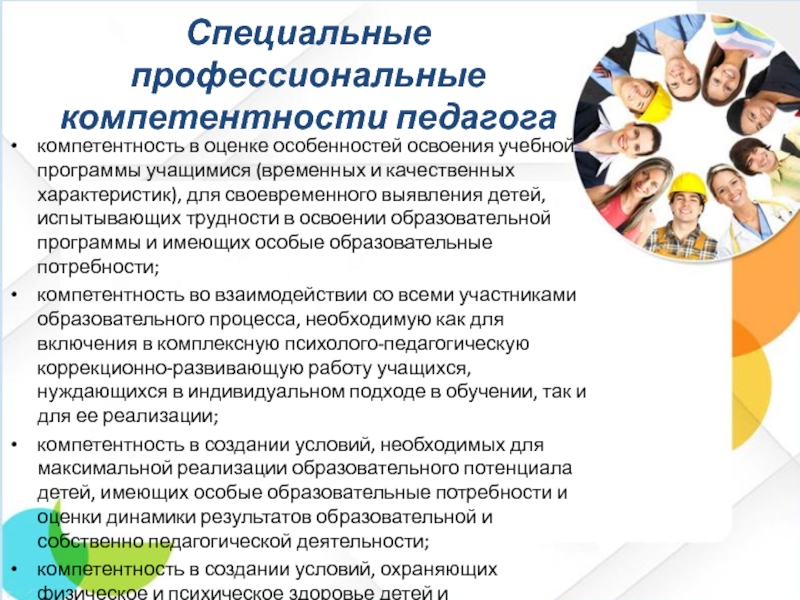 компетентность во взаимодействии со всеми участниками образовательного процесса, необходимую как для включения в комплексную психолого-педагогическую коррекционно-развивающую работу учащихся, нуждающихся в индивидуальном подходе в обучении, так и для ее реализации;