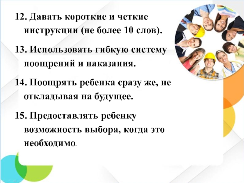 Слайд 1512. Давать короткие и четкие инструкции (не более 10 слов).