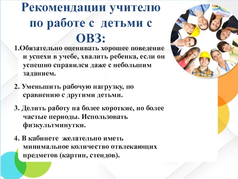 Слайд 13Рекомендации учителю по работе с детьми с ОВЗ: