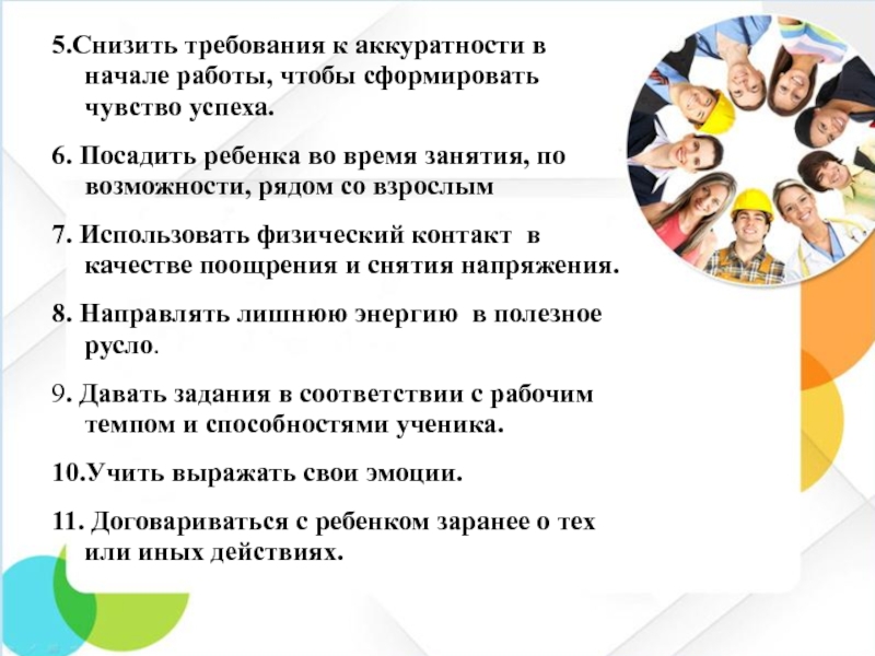 Слайд 145.Снизить требования к аккуратности в начале работы, чтобы сформировать чувство успеха.