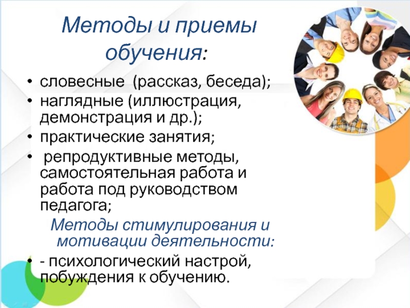 репродуктивные методы, самостоятельная работа и работа под руководством педагога;