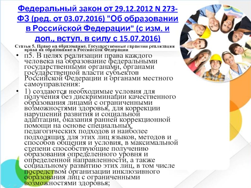 Слайд 2Федеральный закон от 29.12.2012 N 273-ФЗ (ред. от 03.07.2016) "Об образовании