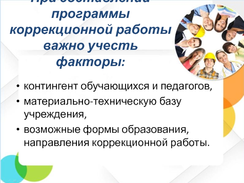 Слайд 8При составлении программы коррекционной работы важно учесть факторы: