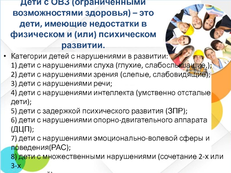 Слайд 5Дети с ОВЗ (ограниченными возможностями здоровья) – это дети, имеющие недостатки