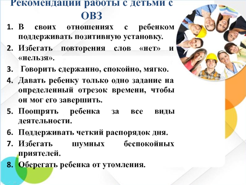 Слайд 11Рекомендации работы с детьми с ОВЗ