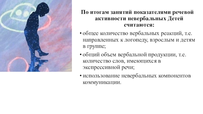 Слайд 17По итогам занятий показателями речевой активности невербальных Детей считаются: