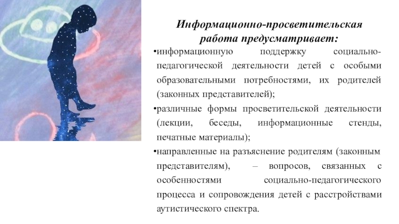 направленные на разъяснение родителям (законным представителям), – вопросов, связанных с особенностями социально-педагогического процесса и сопровождения детей с расстройствами аутистического спектра.