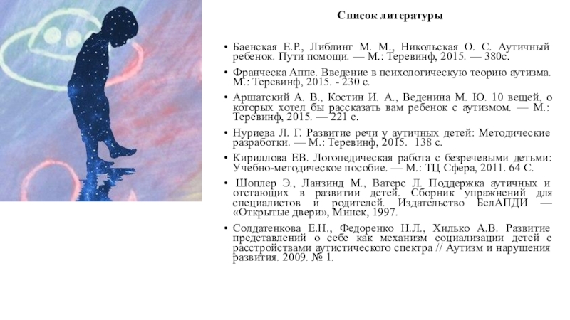 Аршатский А. В., Костин И. А., Веденина М. Ю. 10 вещей, о которых хотел бы рассказать вам ребенок с аутизмом. — М.: Теревинф, 2015. — 221 с.