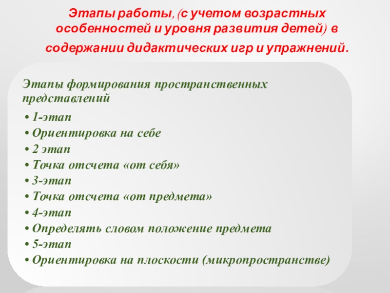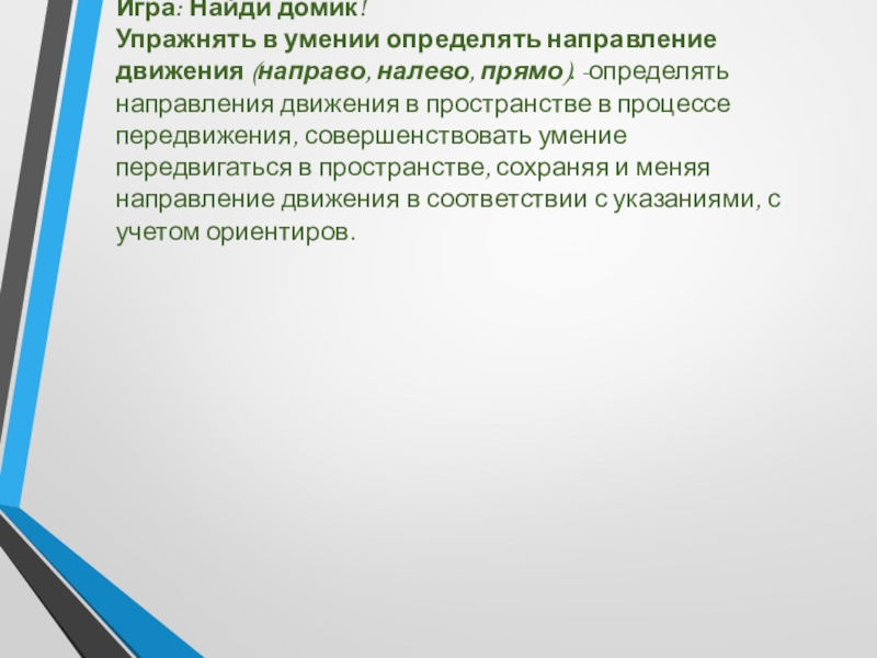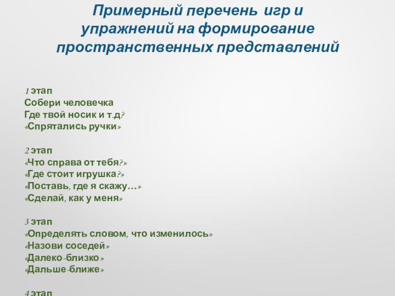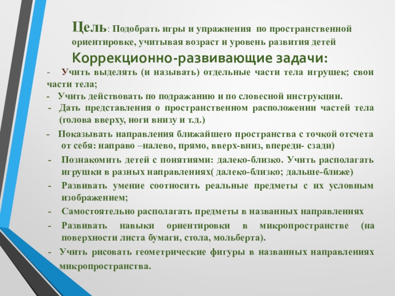 Цель: Подобрать игры и упражнения по пространственной ориентировке, учитывая возраст и уровень развития детей