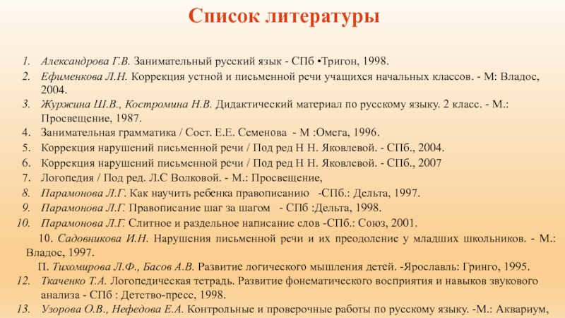 10. Садовникова И.Н. Нарушения письменной речи и их преодоление у младших школьников. - М.: Владос, 1997.
