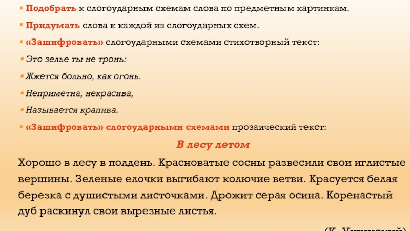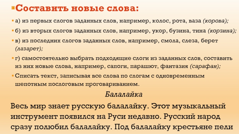 г) самостоятельно выбрать подходящие слоги из заданных слов, составить из них новые слова, например, сапоги, парашют, фантазия (сарафан);