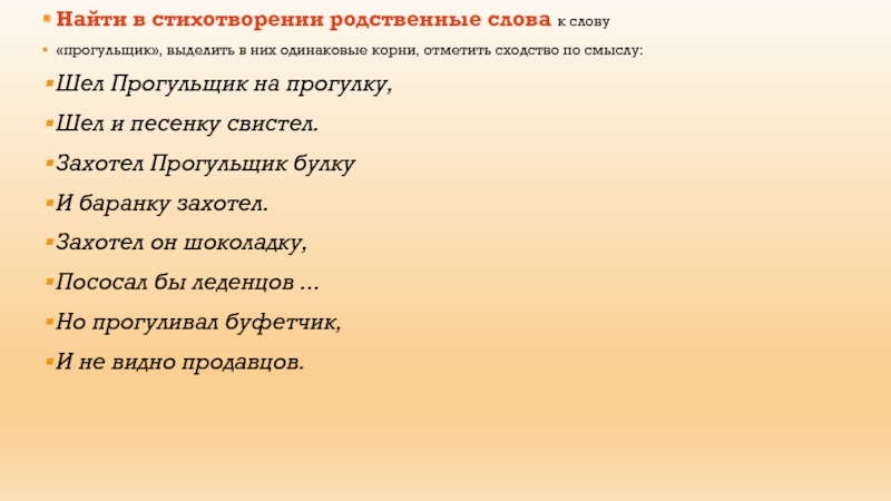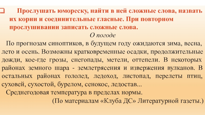 Слайд 36 Прослушать юмореску, найти в ней сложные слова, назвать их корни и
