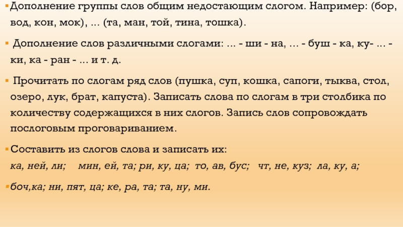 Дополнение слов различными слогами: ... - ши - на, ... - буш - ка, ку- ... - ки, ка - ран - ... и т. д.