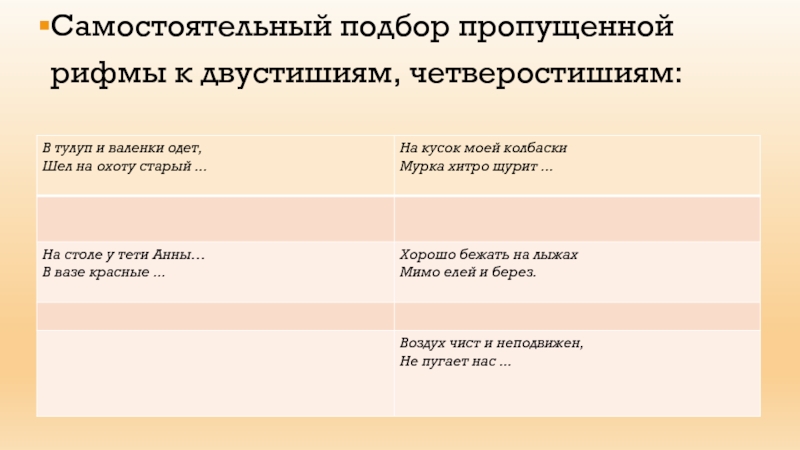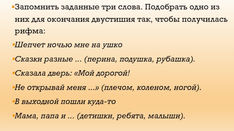 Слайд 14Запомнить заданные три слова. Подобрать одно из них для окончания двустишия