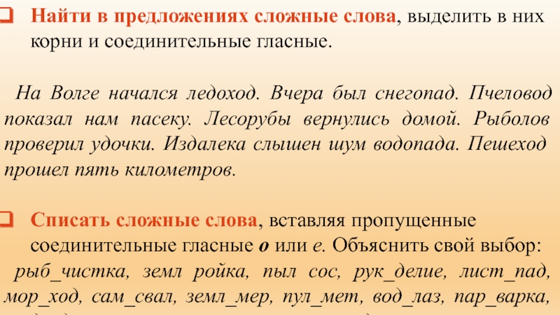 Слайд 33Найти в предложениях сложные слова, выделить в них корни и соединительные