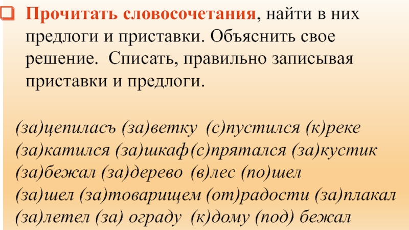 Слайд 39Прочитать словосочетания, найти в них предлоги и приставки. Объяснить свое решение.