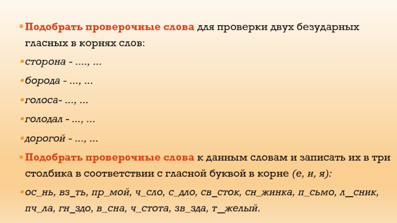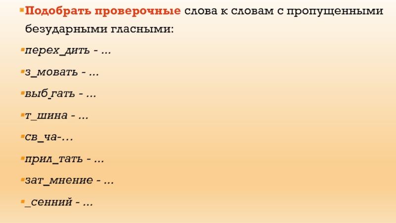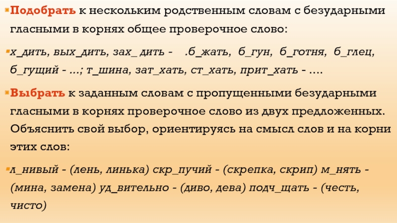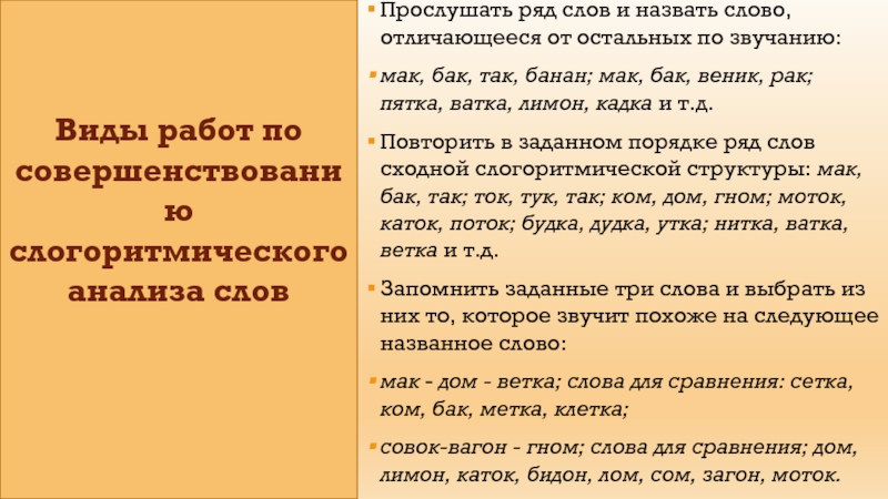 Слайд 9Дополнение группы слов общим недостающим слогом. Например: (бор, вод, кон, мок),