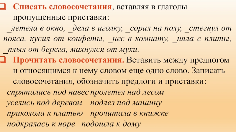 Слайд 38Списать словосочетания, вставляя в глаголы пропущенные приставки: