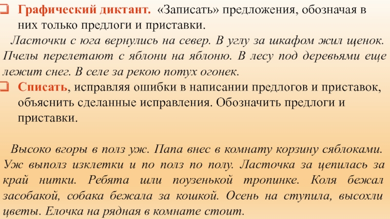 Слайд 43Графический диктант. «Записать» предложения, обозначая в них только предлоги и приставки.
