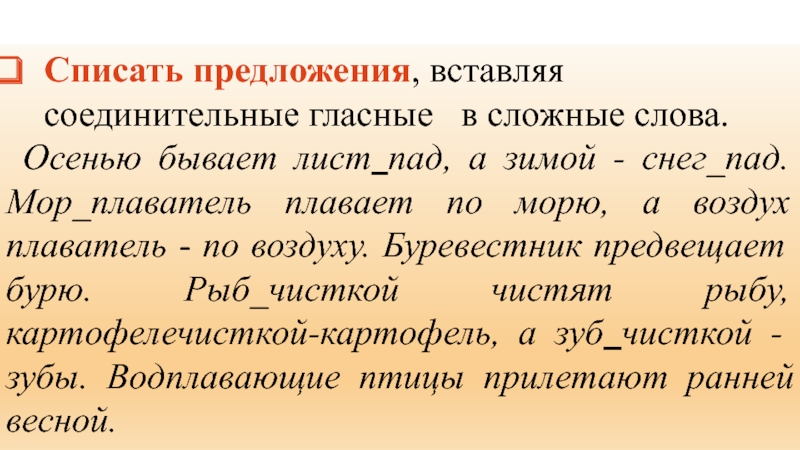 Слайд 35Списать предложения, вставляя соединительные гласные в сложные слова.