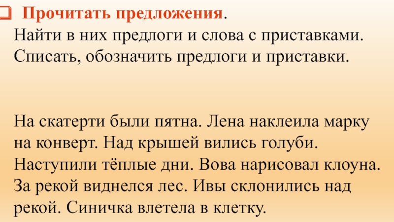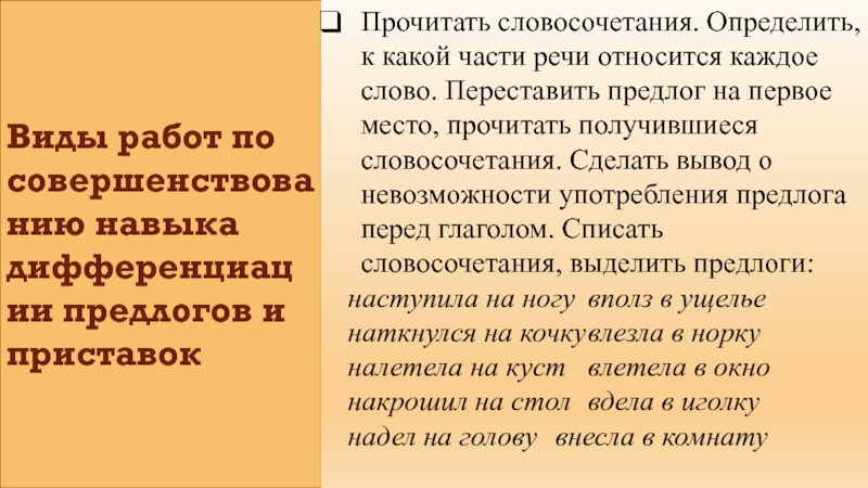 к какой части речи относится каждое слово. Переставить предлог на первое место, прочитать получившиеся словосочетания. Сделать вывод о невозможности употребления предлога перед глаголом. Списать словосочетания, выделить предлоги: