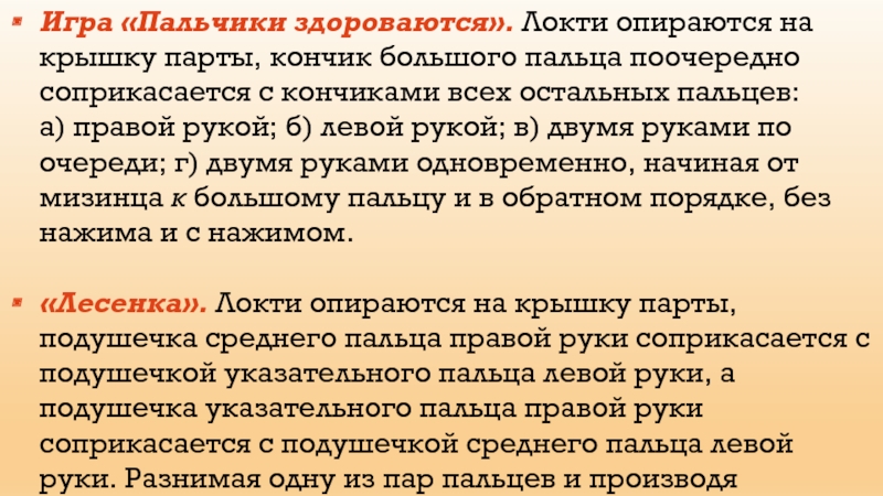 Слайд 3Игра «Пальчики здороваются». Локти опираются на крышку парты, кончик большого пальца