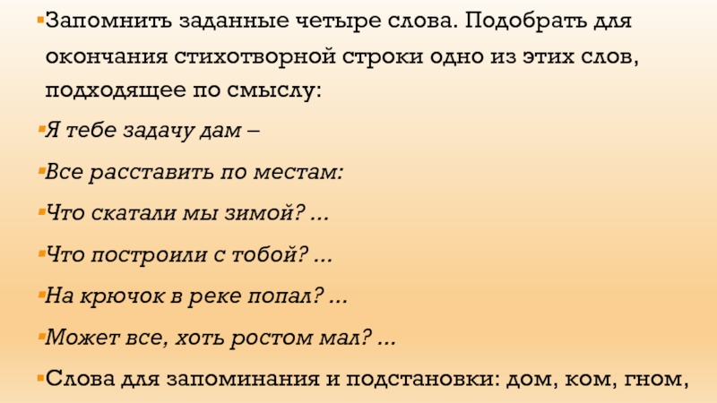 Слайд 13Запомнить заданные четыре слова. Подобрать для окончания стихотворной строки одно из
