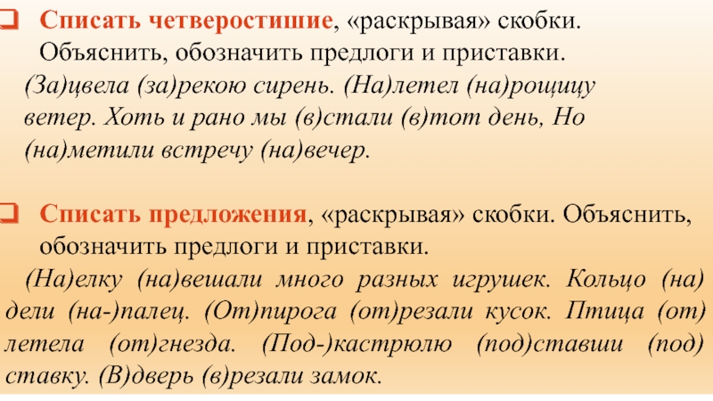 Слайд 41Списать четверостишие, «раскрывая» скобки. Объяснить, обозначить предлоги и приставки.