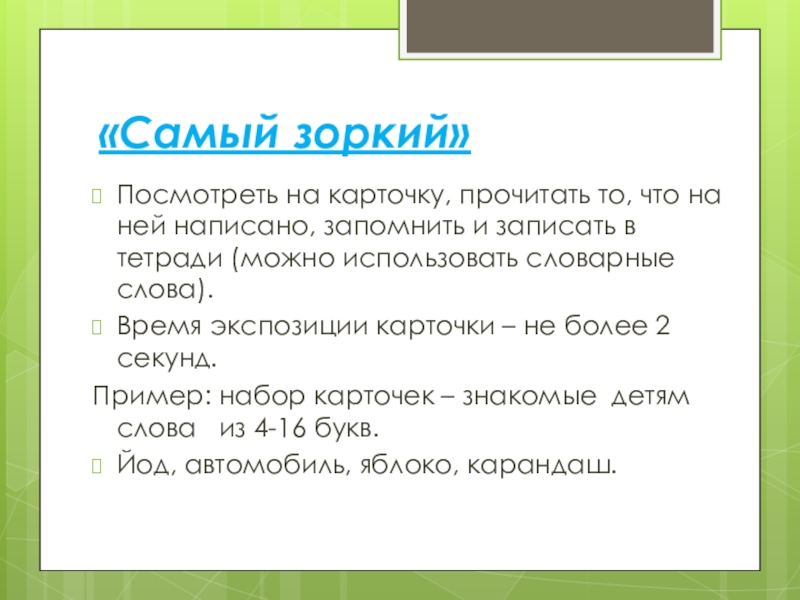 Пример: набор карточек – знакомые детям слова из 4-16 букв.