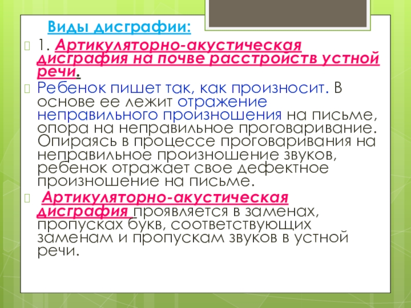 1. Артикуляторно-акустическая дисграфия на почве расстройств устной речи.