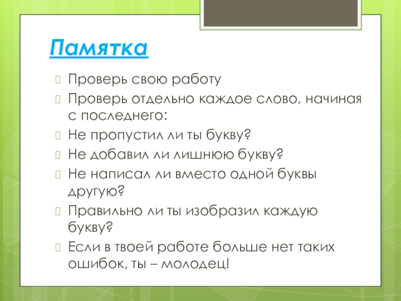 текста с помощью карточки- памятки. Возможность пользоваться карточкой на начальном этапе овладения навыком самоконтроля делает проверку более эффективной, значительно повышает активность детей.