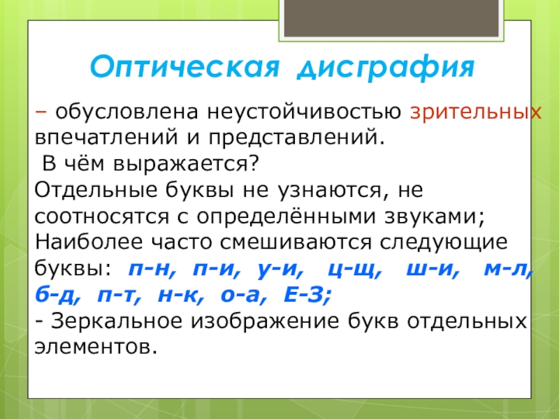 В письменных работах при этом нарушении появляются ошибки в виде замен букв сходных по начертанию или имеющих одинаковые элементы. Наиболее часто наблюдаются смешения следующих букв: д-б, п-н, п-и, ш-щ, н-к, м-л и др.