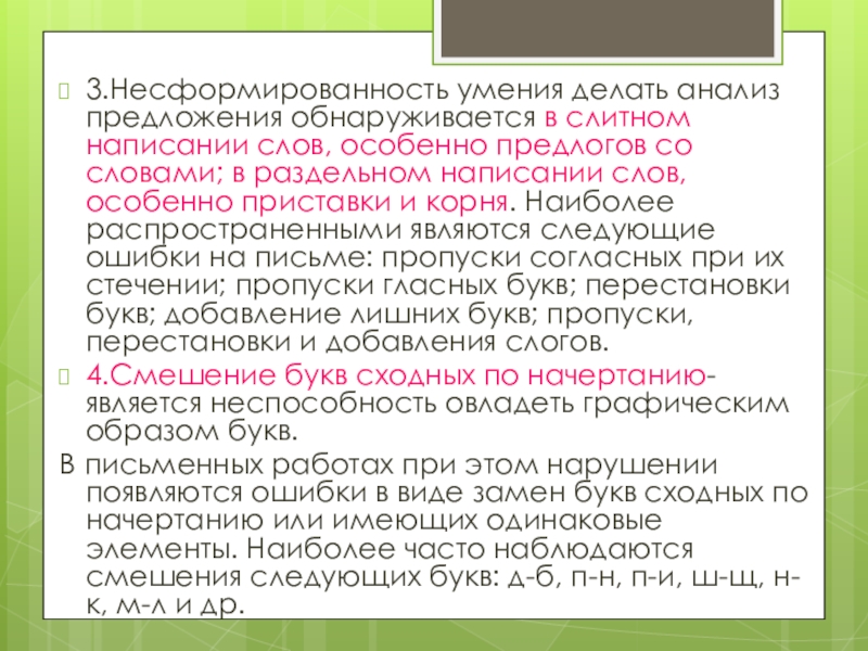 предлогов со словами; в раздельном написании слов, особенно приставки и корня. Наиболее распространенными являются следующие ошибки на письме: пропуски согласных при их стечении; пропуски гласных букв; перестановки букв; добавление лишних букв; пропуски, перестановки и добавления слогов.