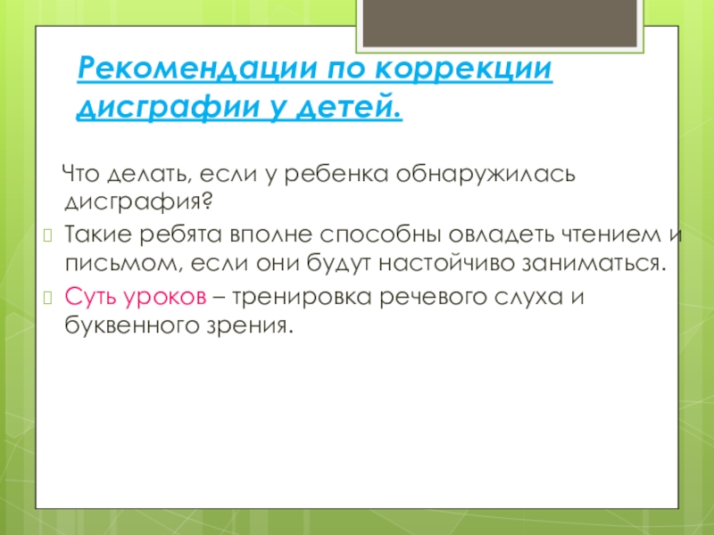 Слайд 13Рекомендации по коррекции дисграфии у детей.